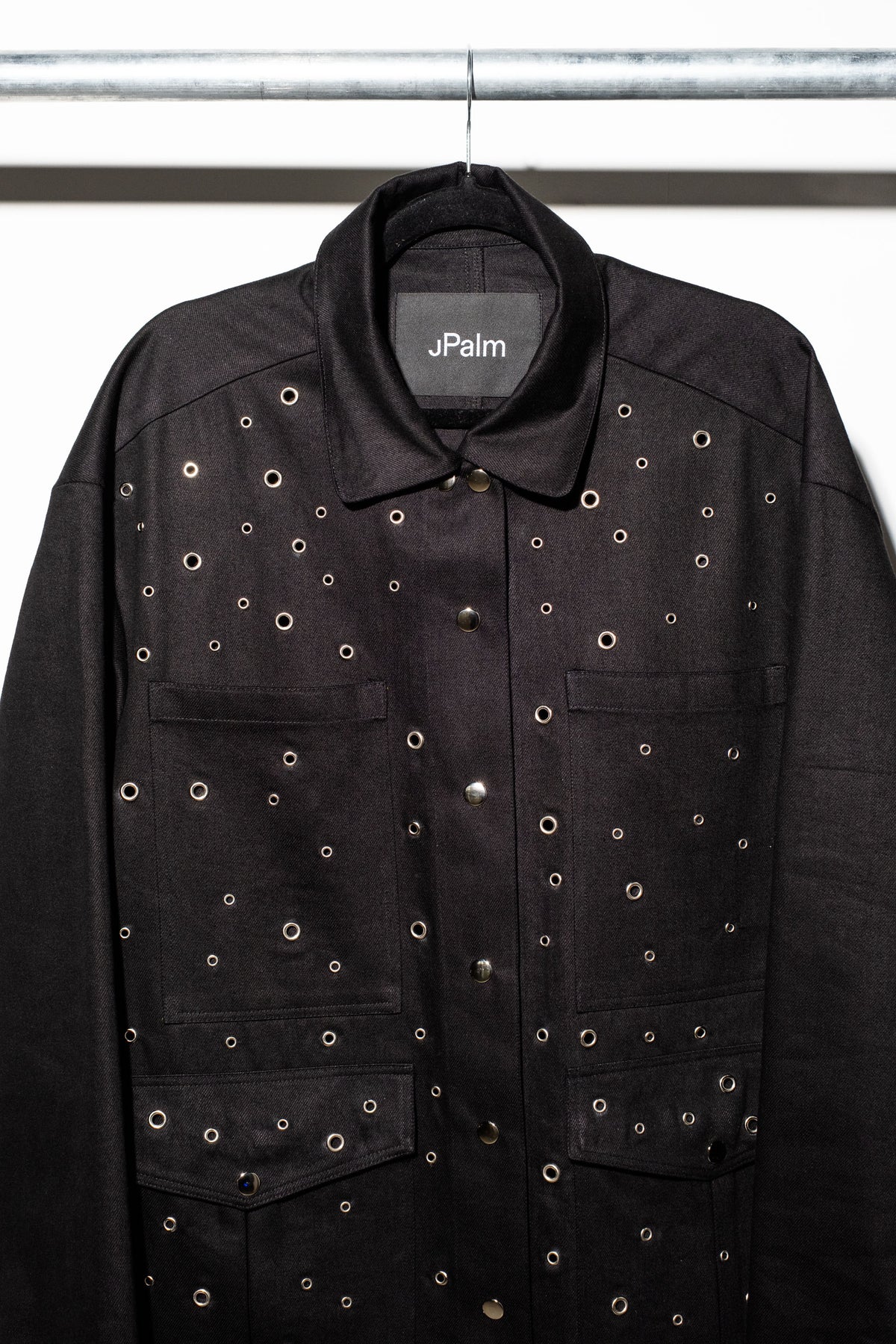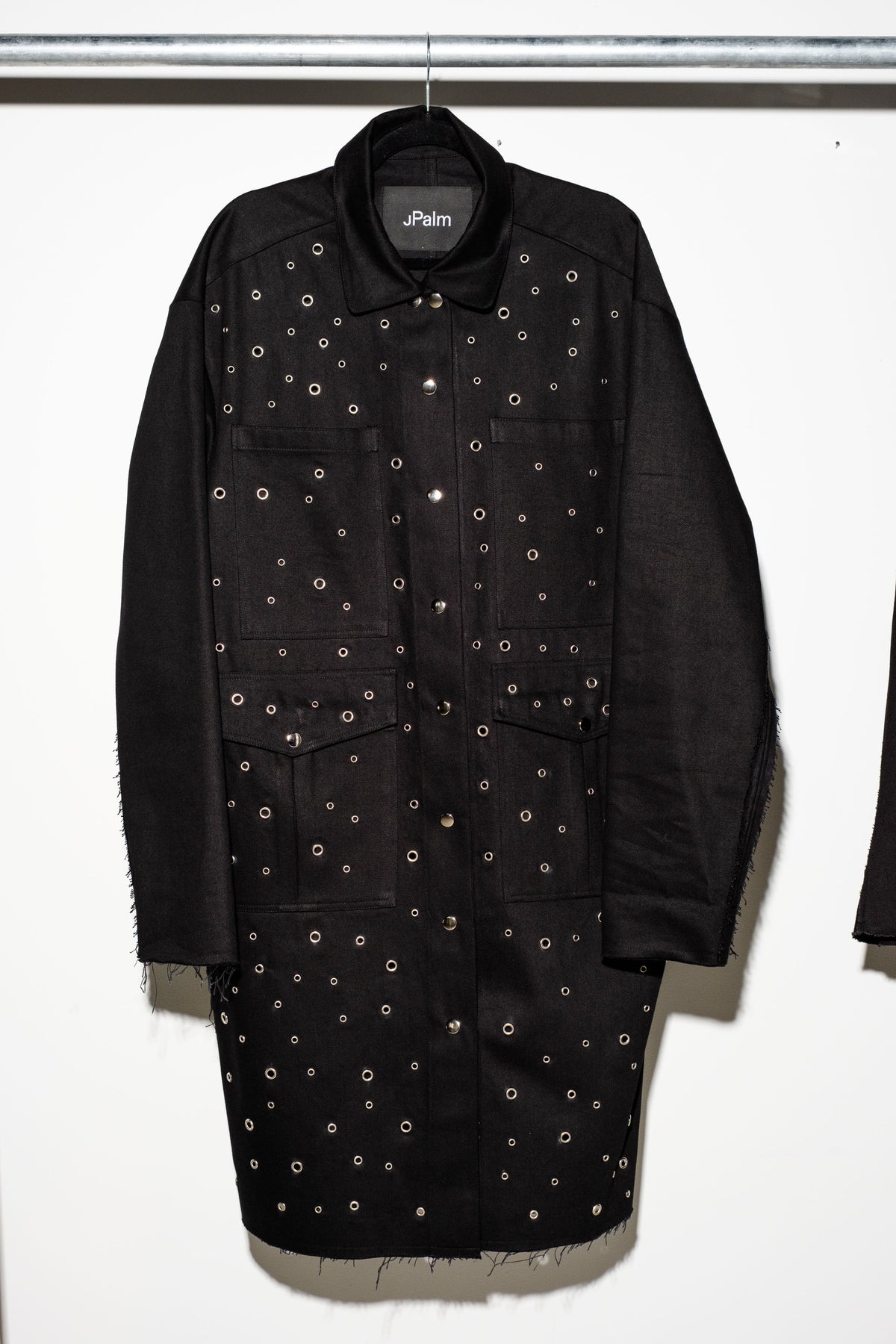 This very limited-edition version is hand-finished in the JPalm workroom with metal eyelets set across both front panels. Each eyelet is applied by hand - a slow, labour-intensive process that makes every piece truly unique. Three different sizes of eyelets create a scattered, polka-dot effect, giving each coat its own distinct rhythm and texture.