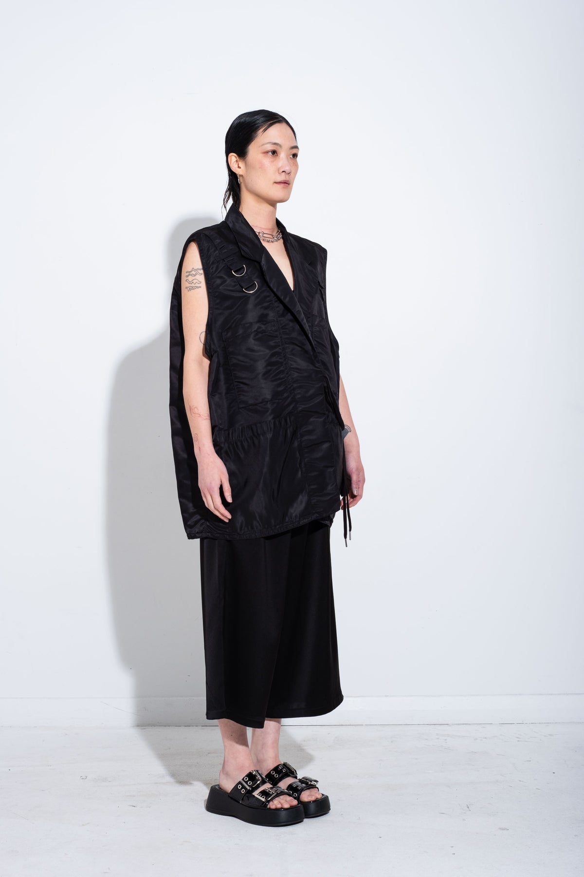 A structured, versatile layer with attitude. The Ida Vest features oversized patch pockets, a chest key tab, and d-rings, and tie closure details, giving it a utilitarian edge while keeping the silhouette relaxed and oversized. The lapel adds a tailored touch, balancing formality with ease.