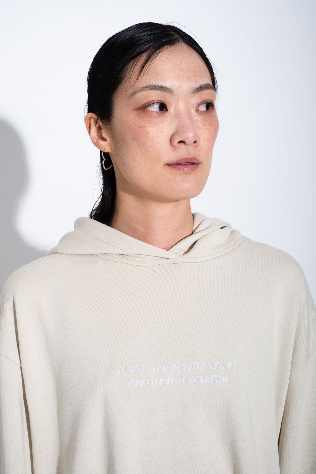 This limited JPALM hoodie features the embroidered line “I LEFT THE LIGHTS ON IN ANOTHER DIMENSION” - a small ode to the 1000+ photos on designer Julia Palm’s phone of the unplugged iron in the workroom. A quote that represents the flickers of anxiety brain that keep you up at night, but ultimately aren’t true.