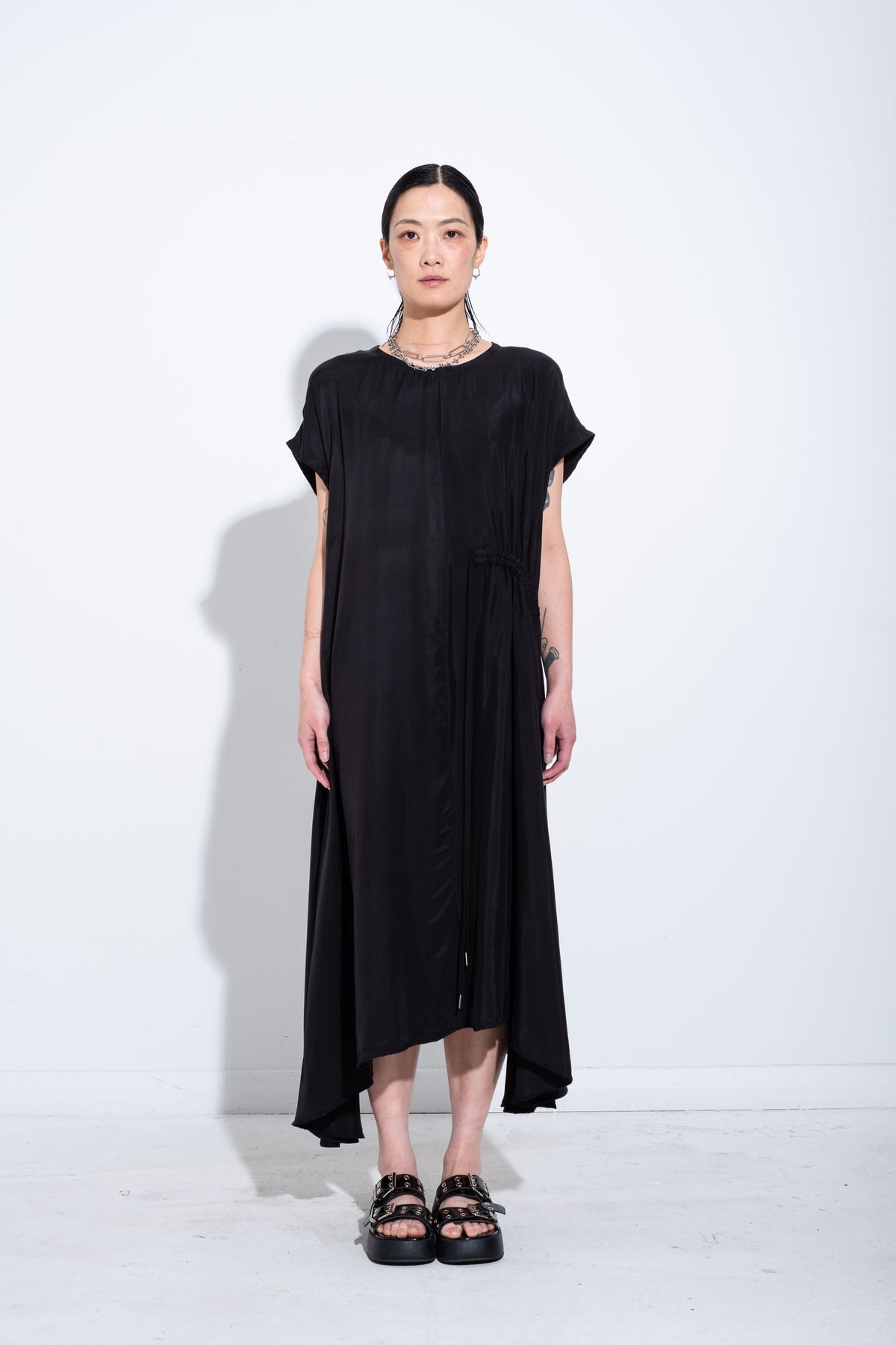 Cut to fall softly from the shoulder line, it drapes fluidly through the side seams, creating that signature flow with every step. The neckline and armholes are finished with a neat bias bind for a clean, durable edge, and a subtle drawstring detail allows you to adjust the shape as you like - cinched or free.